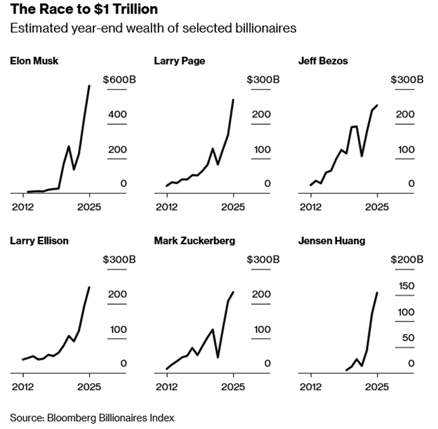 "Today’s super-wealthy can also change the world with their philanthropy," Steverman writes. "But most of the contenders for trillionaire wouldn’t need to give away a cent to affect our lives. The digital worlds where we spend more and more of our time are under their direct control. We argue and entertain ourselves on their social media platforms, and their rush toward AI has the potential to change the course of everything from our careers to the climate."